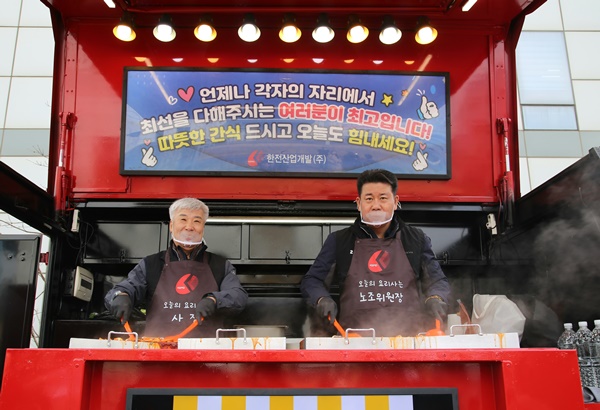 ![]() 한전산업개발은 일선 근무자들의 노고를 격려하기 휘해 노사합동 푸드트럭을 운영, 현장 근무자들에게 직접 조리한 떡볶이와 어묵을 나누어주는 현장소통 행사를 진행했다. |
